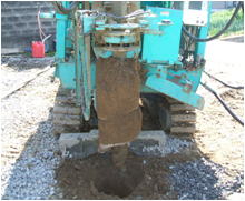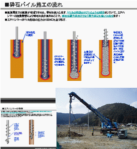 ドリルを右回転させることにより土砂を掘削し砕石パイルを構築する方法。 |